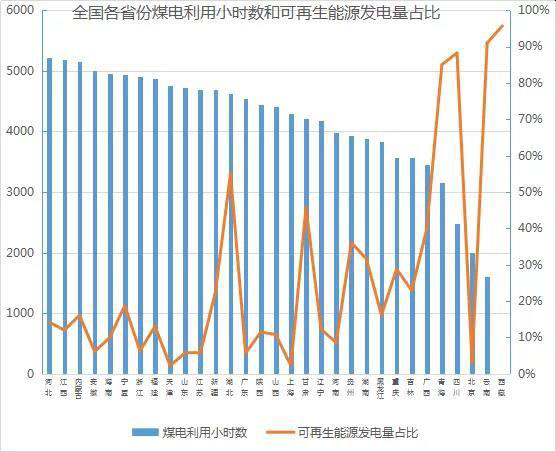 ▲圖3:各?。ㄗ灾螀^(qū)、直轄市)煤電利用小時數(shù)和可再生能源占比排序