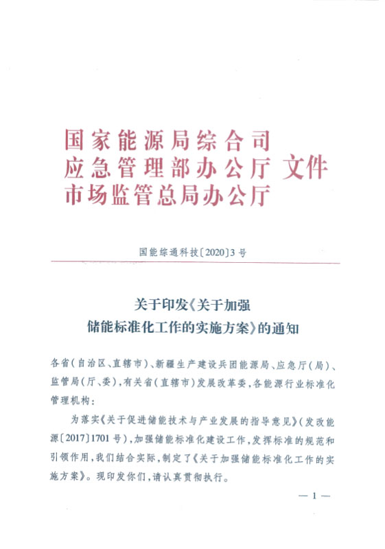 關(guān)于加強(qiáng)儲(chǔ)能標(biāo)準(zhǔn)化工作的實(shí)施方案
