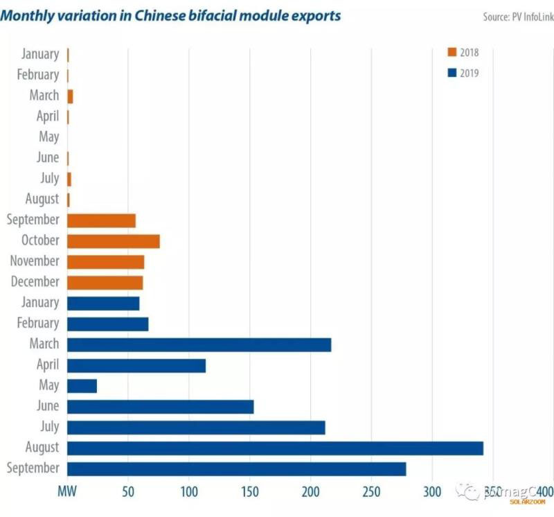 自2018年末至進入2019年以來,雙面組件的出口量出現明顯增長趨勢。歐洲、日本、美國等對高效產品有需求的市場,中國雙面光伏組件出口呈現逐年增長的趨勢。