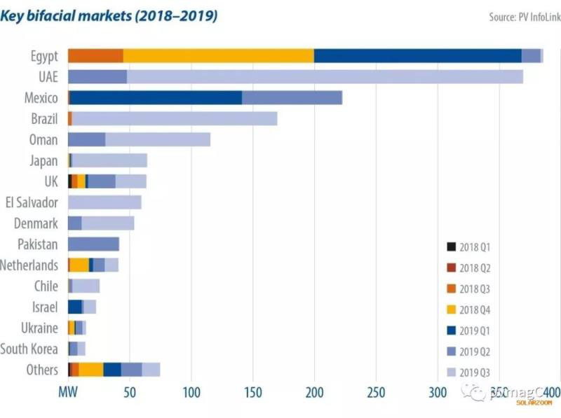雙面組件相比單面組件具有5%~30%的功率增益,加之在當前單雙面電池價格逐漸趨于同價,從降低度電成本的角度上看,雙面的降本效應明顯。2019年,可以看到一些例如阿曼、阿聯酋、墨西哥等新興市場的大型地面電站項目開始采用雙面組件。