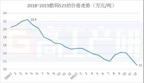 2019年三元材料市場(chǎng)規(guī)模增幅遠(yuǎn)小于出貨量增速,主要由于三元材料價(jià)格下降導(dǎo)致,數(shù)碼523價(jià)格從2018年高峰時(shí)22.4萬(wàn)/噸下降至當(dāng)前11萬(wàn)/噸。