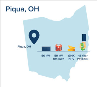 在皮奎市,商業(yè)需求收費(fèi)很高(每千瓦16美元),與典型的獨(dú)立部署的太陽能發(fā)電設(shè)施的14年投資回收期相比,對(duì)太陽能+儲(chǔ)能項(xiàng)目的投資可以在不到8年的時(shí)間內(nèi)收回投資。對(duì)于俄亥俄州的典型中型商業(yè)客戶來說,每年將節(jié)省10.5萬美元。