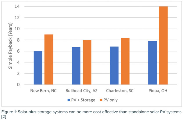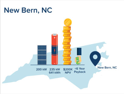 在像新伯爾尼這樣的城市中,商業(yè)需求收費(fèi)高(高于25美元/千瓦),加上使用時(shí)間費(fèi)率(TOU)結(jié)構(gòu),太陽能+儲(chǔ)能項(xiàng)目可能是一項(xiàng)非常誘人的經(jīng)濟(jì)投資。其簡(jiǎn)單的投資回報(bào)期只有六年,甚至比獨(dú)立部署的太陽能發(fā)電設(shè)施的回報(bào)期還少。對(duì)于北卡羅來納州一個(gè)典型的中型商業(yè)客戶來說,每年將節(jié)省15.5萬美元。