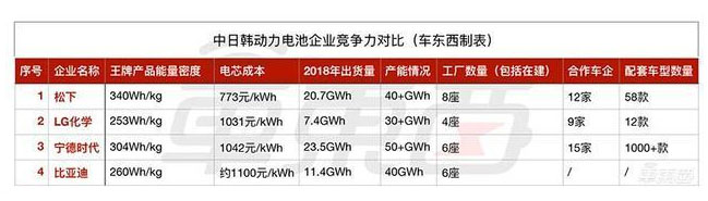 車東西根據(jù)公開資料,整理了中日韓動(dòng)力電池企業(yè)競(jìng)爭(zhēng)力的核心指標(biāo)對(duì)比。