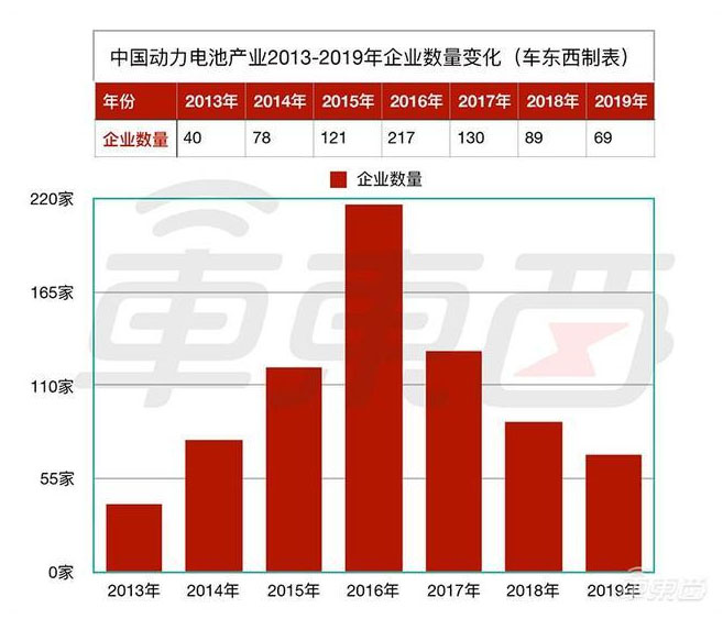從玩家情況來看,中國(guó)動(dòng)力電池產(chǎn)業(yè)的集中化趨勢(shì)越發(fā)明顯,企業(yè)數(shù)量從2016年的200+家縮減至2019年的60+家。