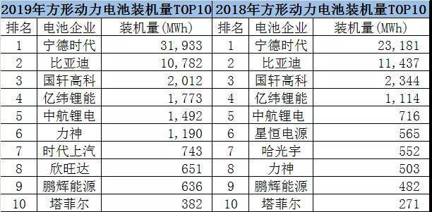 位列2019方形動力電池裝機量TOP10的企業(yè)為(按裝機電量高低排列):寧德時代、比亞迪、國軒高科、億緯鋰能、中航鋰電、力神、時代上汽、欣旺達、鵬輝能源、塔菲爾。