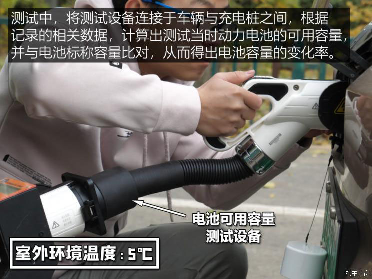 在動(dòng)力電池可用容量測(cè)試中,使用了專(zhuān)業(yè)的動(dòng)力電池容量測(cè)試設(shè)備,測(cè)試時(shí)將該設(shè)備連接于充電樁與被測(cè)車(chē)輛之間,通過(guò)監(jiān)測(cè)到的充電電壓、電流和充入電量等動(dòng)態(tài)數(shù)據(jù),以及動(dòng)力電池SOC的變化率,計(jì)算出車(chē)輛測(cè)試時(shí)動(dòng)力電池的可用容量,并與車(chē)企標(biāo)稱(chēng)的容量進(jìn)行比對(duì),從而得出動(dòng)力電池當(dāng)時(shí)的可用容量變化率。