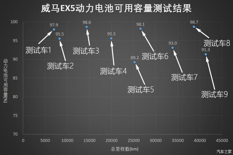 9輛威馬EX5均是NEDC續(xù)航里程為400km的車(chē)型,該款車(chē)型官方標(biāo)稱(chēng)的動(dòng)力電池容量為52.56kWh。這9輛車(chē)行駛的總里程數(shù)差異較大,從將近7000km到超過(guò)41000km不等。
