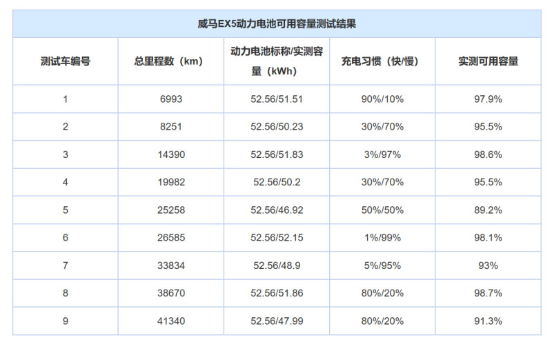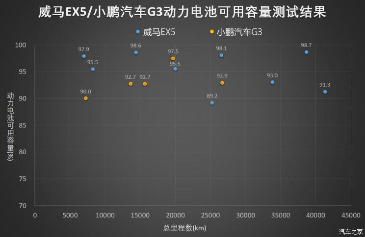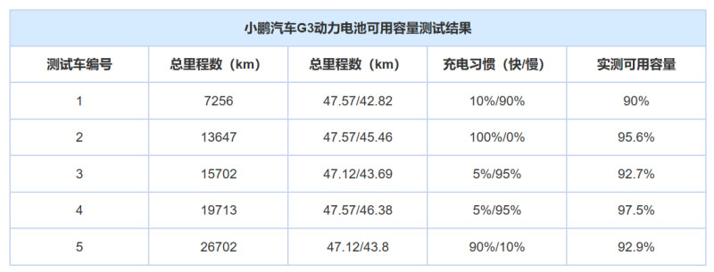 測(cè)試結(jié)果顯示,9輛威馬EX5車(chē)型的動(dòng)力電池可用容量平均減少4.68%,5輛小鵬G3車(chē)型平均減少6.26%。雖然從平均數(shù)值上看,威馬EX5的數(shù)據(jù)較好,但其測(cè)得的可用容量減少量在1.9%-10.8%;而小鵬G3測(cè)得的可用容量減少量在2.5%-10%。所有被測(cè)車(chē)輛的動(dòng)力電池可用容量變化,均在正常范圍之內(nèi)。