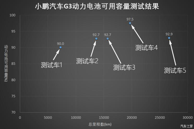 5輛小鵬G3均為2018款車(chē)型,其中2輛是NECD續(xù)航里程為351km的車(chē)型,官方標(biāo)稱(chēng)的動(dòng)力電池容量為47.1kWh;3輛是NEDC續(xù)航里程為365km的車(chē)型,官方標(biāo)稱(chēng)的動(dòng)力電池容量為47.6kWh。5輛測(cè)試車(chē)的行駛里程也有著不小的差距,從剛剛超過(guò)7000km到超過(guò)26000km不等。