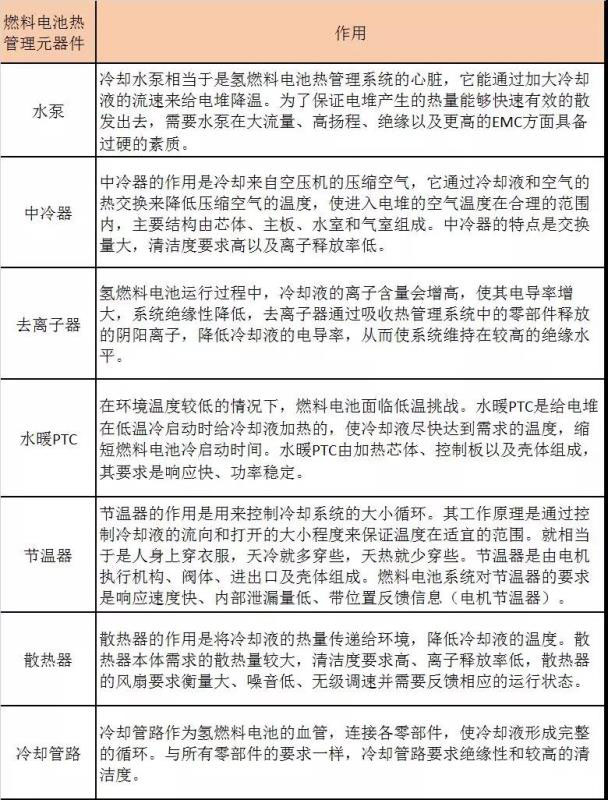 氫燃料電池的熱管理系統(tǒng)將電堆反應(yīng)生成的熱量排出系統(tǒng)外,使電堆維持在適合的溫度區(qū)間工作。事實(shí)上,燃料電池?zé)峁芾硐到y(tǒng)主要包括燃料電池?zé)峁芾恚ㄈ剂想姵乇倔w)和動力系統(tǒng)平臺熱管理兩部分。從燃料電池系統(tǒng)熱管理的元器件組成來看,又主要由水泵、節(jié)溫器、去離子器、中冷器、水暖PTC、冷卻模塊及冷卻管路等不同部分組成。