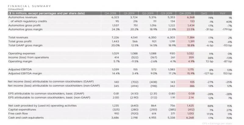 財(cái)報(bào)顯示,特斯拉在2019年第四季度營(yíng)收73.84億美元,同比增長(zhǎng)2%,凈利潤(rùn)為1.32億美元,去年同期該數(shù)字2.10億美元;歸屬于普通股股東的凈利潤(rùn)為1.05億美元,同比下降25%。這是繼2018年連續(xù)兩個(gè)季度盈利后,特斯拉再次實(shí)現(xiàn)連續(xù)兩季度盈利。