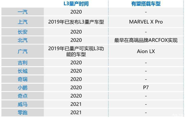 『多家車企計劃2020-2021年量產(chǎn)L3車型 資料來源:中汽中心』
