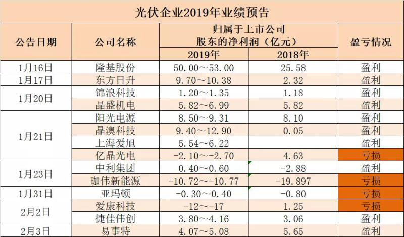 近日,隆基股份、東方日升、錦浪科技、晶盛機(jī)電、陽(yáng)光電源、億晶光電、晶澳科技、上海愛(ài)旭(ST新梅更名而來(lái))、捷佳偉創(chuàng)、易事特等14家企業(yè)相繼發(fā)布2019年業(yè)績(jī)預(yù)告。