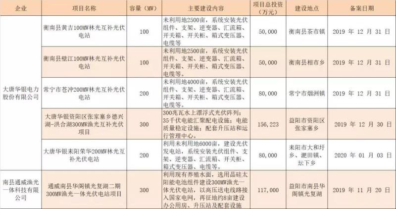 2月4日,湖南省發(fā)改委公示了大唐華銀電力股份有限公司(以下簡稱“華銀電力”)、南縣通威漁光一體科技有限公司(以下簡稱“南縣通威”)共6個、總規(guī)模1.2GW的光伏項目備案信息。