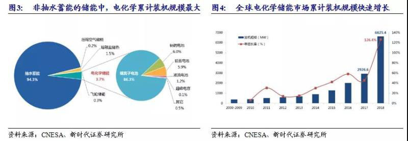 電化學(xué)儲(chǔ)能近年來(lái)發(fā)展迅速,整體占比仍然較低。據(jù)中關(guān)村儲(chǔ)能產(chǎn)業(yè)技術(shù)聯(lián)盟(CNESA)統(tǒng)計(jì),截至2018年底,全球累計(jì)已投運(yùn)儲(chǔ)能項(xiàng)目181GW,同比增長(zhǎng)3.19%,其中電化學(xué)儲(chǔ)能累計(jì)裝機(jī)6.625GW,同比增長(zhǎng)126.4%,截至2018年底電化學(xué)儲(chǔ)能占全部?jī)?chǔ)能累計(jì)裝機(jī)的3.7%,是抽水蓄能以外累計(jì)裝機(jī)規(guī)模最大的技術(shù)路線。