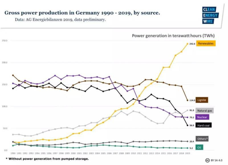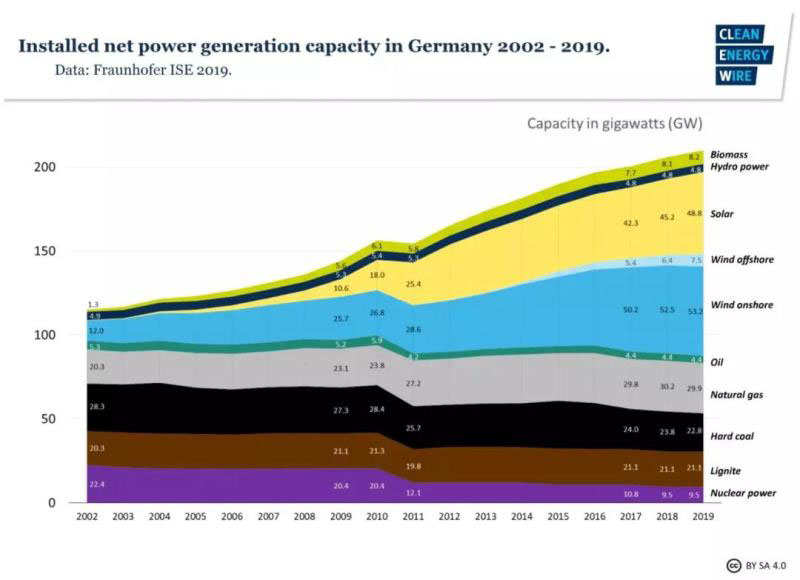 根據(jù)德國根據(jù)能源市場研究組織AG Energiebilanzen初步數(shù)據(jù),2019年底德國發(fā)電裝機(jī)容量為: