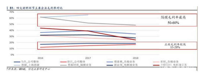 5.1 四大材料環(huán)節(jié)對(duì)比,正極競(jìng)爭(zhēng)激烈,隔膜高壁壘享受高利潤(rùn)