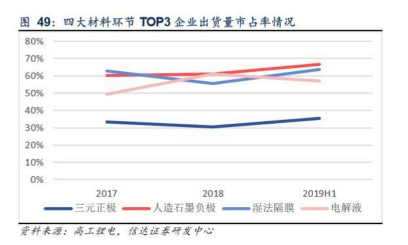 從具體企業(yè)來(lái)看,正極材料TOP3企業(yè)市占率均在12%左右,且競(jìng)爭(zhēng)格局處于動(dòng)態(tài)變化;負(fù)極材料人造石墨市場(chǎng)江西紫宸、 上海杉杉和東莞凱金競(jìng)爭(zhēng)優(yōu)勢(shì)較為明顯,市占率均在20%左右,后續(xù)廠家市占率均不及10%;隔膜環(huán)節(jié)上海恩捷一家獨(dú)大, 2019H1市占率已達(dá)41.5%,蘇州捷力優(yōu)勢(shì)地位也較為明顯;電解液環(huán)節(jié)天賜材料依托產(chǎn)業(yè)鏈整合具備成本優(yōu)勢(shì),其重點(diǎn)突破 國(guó)內(nèi)動(dòng)力電池市場(chǎng),市占率在28%左右較為明顯,其次為新宙邦和國(guó)泰華榮,2019年上半年市占率分別為18.2%和10.7%。