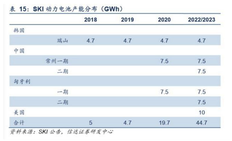 SKI規(guī)劃2022年產(chǎn)能60GWh,2025年100GWh。2018年,SKI僅在韓國(guó)瑞山擁有4.7GWh動(dòng)力電池產(chǎn)能。至2020年, 其在中國(guó)江蘇與匈牙利產(chǎn)能有望釋放,整體產(chǎn)能提升將提升至20GWh。同時(shí),SKI美國(guó)工廠預(yù)計(jì)將于2021年建成,首期形 成產(chǎn)能10GWh,至2025年形成產(chǎn)能20GWh,遠(yuǎn)期美國(guó)基地規(guī)劃50GWh產(chǎn)能。此外,2019年5月,其表示計(jì)劃投資約4.88 億美元在中國(guó)組建第二座電池工廠,但暫未透露選址及產(chǎn)能相關(guān)信息。綜合來(lái)看,公司規(guī)劃2022年形成60GWh動(dòng)力電池產(chǎn) 能,至2025年形成100GWh產(chǎn)能。