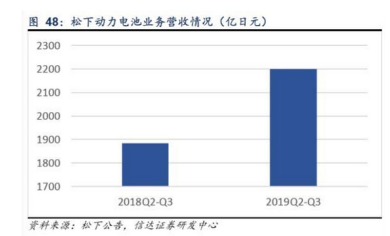 2020財(cái)年起(2019Q2起),松下將其原汽車及工業(yè)系統(tǒng)業(yè)務(wù)拆分為汽車業(yè)務(wù)和工業(yè)解決方案兩項(xiàng)業(yè)務(wù),其中汽車業(yè)務(wù)包含汽 車解決方案和動(dòng)力電池兩項(xiàng)業(yè)務(wù)。2019.04-2019.09,受產(chǎn)能擴(kuò)張帶來(lái)的銷量增長(zhǎng),公司動(dòng)力電池業(yè)務(wù)實(shí)現(xiàn)營(yíng)收2119.3億日 元(約136億人民幣),同比增長(zhǎng)16.8%。營(yíng)業(yè)利潤(rùn)方面,公司未單獨(dú)披露動(dòng)力電池業(yè)務(wù)營(yíng)業(yè)利潤(rùn),但稱銷量增長(zhǎng)帶動(dòng)動(dòng)力電 池業(yè)務(wù)利潤(rùn)增長(zhǎng)。