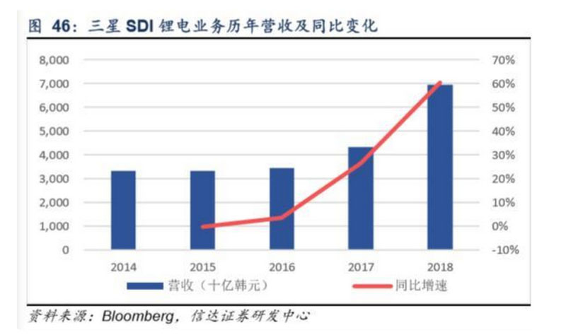 三星SDI動(dòng)力+儲(chǔ)能虧損規(guī)模縮小,2019基本盈虧平衡。近年公司鋰電業(yè)務(wù)營(yíng)收規(guī)模逐年擴(kuò)張,2018年實(shí)現(xiàn)營(yíng)收6.95萬(wàn)億韓元(約419億人民幣),同比增長(zhǎng)61%,實(shí)現(xiàn)營(yíng)業(yè)利潤(rùn)3974億韓元(約23.95億人民幣),同比扭虧為盈,對(duì)應(yīng)營(yíng)業(yè)利潤(rùn) 率水平為5.7%。分業(yè)務(wù)來(lái)看,公司小型鋰電業(yè)務(wù)2017年扭虧,推動(dòng)鋰電業(yè)務(wù)利潤(rùn)增長(zhǎng),包括動(dòng)力+儲(chǔ)能電池在內(nèi)的大型鋰電 產(chǎn)品當(dāng)前仍處虧損狀態(tài), 2019年全年基本保持盈虧平衡,2020年隨著動(dòng)力電池放量盈利能力將逐步提升。
