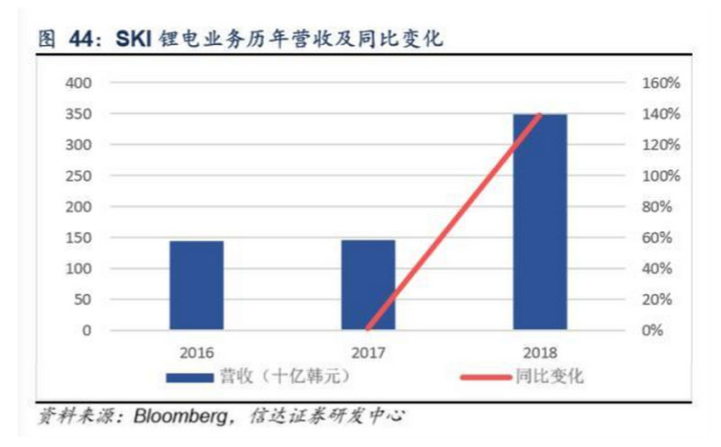 SKI動(dòng)力+儲(chǔ)能仍處虧損狀態(tài),且呈擴(kuò)大趨勢(shì)。SK Innovation鋰電業(yè)務(wù)主要生產(chǎn)動(dòng)力電池及儲(chǔ)能電池,同時(shí)公司還有鋰電隔 膜產(chǎn)品(屬材料業(yè)務(wù))。2018年SKI鋰電業(yè)務(wù)實(shí)現(xiàn)營(yíng)收3482億韓元(對(duì)應(yīng)約21億人民幣),同比增長(zhǎng)139%,公司當(dāng)前鋰電 業(yè)務(wù)仍處虧損狀態(tài),且虧損面呈放大趨勢(shì),其中2018年虧損3175億韓元(對(duì)應(yīng)約19億人民幣)。