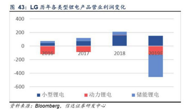 LG Chem動(dòng)力電池2018盈虧基本平衡,2019虧損規(guī)模將擴(kuò)大。公司近年來(lái)鋰電業(yè)務(wù)營(yíng)業(yè)利潤(rùn)主要由儲(chǔ)能電池和小型電池貢獻(xiàn),動(dòng)力電池2016-2017年虧損,2018年基本實(shí)現(xiàn)盈虧平衡,2019年由于波蘭工廠建設(shè)節(jié)奏較緩影響,預(yù)計(jì)虧損規(guī)模將 有所擴(kuò)大。同時(shí),受儲(chǔ)能電池火災(zāi)事故影響,2019年儲(chǔ)能業(yè)務(wù)同樣將面臨較大虧損。