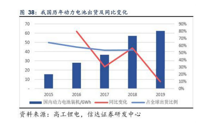 國(guó)內(nèi)市場(chǎng)受新能源汽車產(chǎn)銷同比下滑影響,動(dòng)力電池裝機(jī)增速下降。據(jù)高工鋰電數(shù)據(jù),2019年我國(guó)實(shí)現(xiàn)動(dòng)力電池裝機(jī) 62.38GWh,同比增長(zhǎng)9%(增長(zhǎng)主要是受益單車帶電量提升,2019年國(guó)內(nèi)平均單車帶電量53KWh,去年同期為47KWh)。