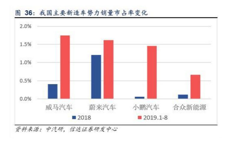 從新造車勢(shì)力看,以威馬、蔚來(lái)、小鵬和合眾新能源為代表的新造車勢(shì)力2019年以來(lái)銷量明顯放量,四家車企合計(jì)銷量市占 率從2018年的1.8%提升至2019年1-8月的5.5%。從銷量絕對(duì)量來(lái)看,新造車勢(shì)力年度銷量在1萬(wàn)輛左右,在未來(lái)國(guó)內(nèi)及 海外傳統(tǒng)汽車龍頭新能源車型銷量放量背景下,其規(guī)模化推進(jìn)進(jìn)程值得進(jìn)一步關(guān)注。