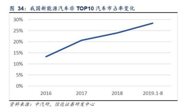 從行業(yè)集中度來(lái)看,新能車企TOP10市占率呈下滑趨勢(shì),非TOP10企業(yè)市占率從2016年的13.3%提升至2019年1-8月的 28.4%。進(jìn)一步來(lái)看,主要受合資車企及新造車勢(shì)力市占率提升影響。