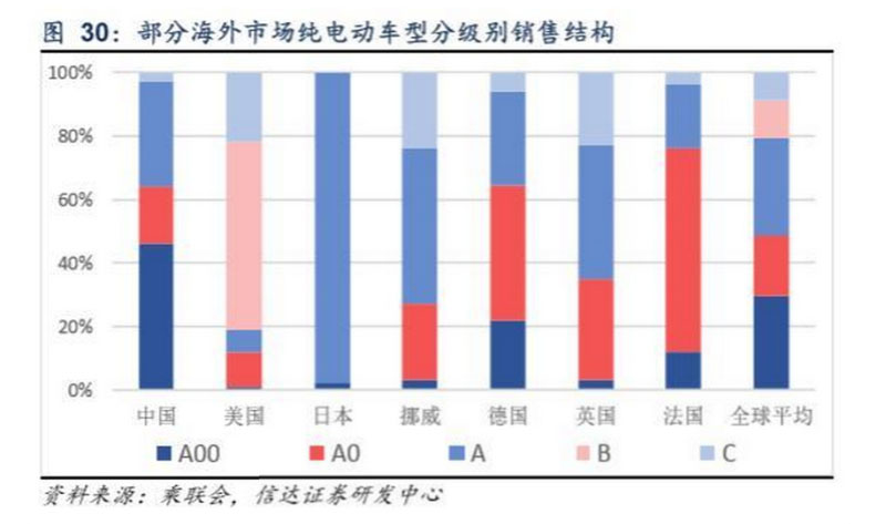 但我們認(rèn)為,行業(yè)高端化趨勢(shì)還沒(méi)有結(jié)束,首先對(duì)比全球新能源汽車銷售結(jié)構(gòu)來(lái)看,美國(guó)、日本、挪威等國(guó)A00級(jí)車型銷售 市占率均不及5%,A0+A00級(jí)車型銷量市占率不及30%,A級(jí)及以上高端化車型仍是主流車型。其次,對(duì)比國(guó)內(nèi)傳統(tǒng)乘用車 市場(chǎng)來(lái)看,傳統(tǒng)乘用車中,轎車市場(chǎng)A級(jí)及以上車型市占率在85%以上,SUV市場(chǎng)A級(jí)及以上車型市占率在75%以上。對(duì)比來(lái)看,新能車高端化車型仍有較為廣闊增長(zhǎng)空間。