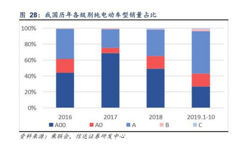 從行業(yè)整體來(lái)看,車型升級(jí)趨勢(shì)明顯。純電動(dòng)市場(chǎng),A00級(jí)銷量占比從2017年的69%降至2019年1-8月的27%,A級(jí)從 23%升至53%;插混市場(chǎng),A級(jí)由82%降至53%,B+C級(jí)由18%提升至46%。