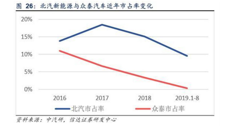 北汽新能源與眾泰汽車近年來(lái)市占率出現(xiàn)較為明顯下滑,分別從2017年的18.4%和6.6%下降至2019年1-8月的9.5%和 0.3%。在政策導(dǎo)向及補(bǔ)貼退坡推動(dòng)行業(yè)高端化升級(jí)的背景下,兩家主力車型北汽EC系列及眾泰E200、云100為中低端A00級(jí)車,主力車型銷量下滑導(dǎo)致公司整體市占率下滑。