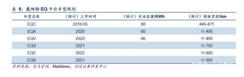 戴姆勒EQ系列首款車型已于2019年上市(國(guó)內(nèi)市場(chǎng)于2019Q4上市,售價(jià)約58萬(wàn)元),在NEDC測(cè)試方法下,帶電量為 80KWh,續(xù)駛里程為445-471km。此外,EQA、EQV系列車型將在2020年逐步量產(chǎn)。
