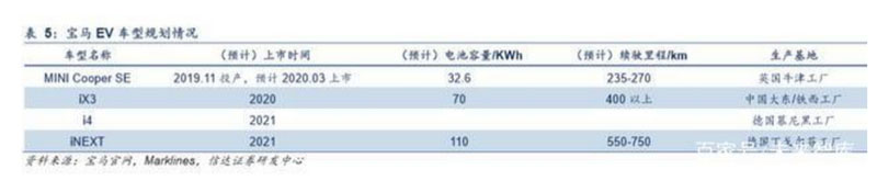 寶馬集團(tuán)規(guī)劃2023年之前推出25款新能源乘用車,其中包括至少13款純電動(dòng)乘用車。具體車型來(lái)看,2019年公司推出 MINI品牌首款純電動(dòng)EV車型 MINI Cooper SE,2020-2021年將陸續(xù)推出首款純電動(dòng)SUV寶馬iX3、純電動(dòng)轎跑寶馬i4以 及新一代產(chǎn)品寶馬iNEXT。