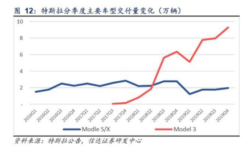Model 3上市以來(lái)交付量快速增長(zhǎng),2019年全年累計(jì)交付36.8萬(wàn)輛,同比增長(zhǎng)49.8%,完成交付目標(biāo)。其中一季度受中國(guó)、 歐洲等的Model 3出貨延遲,以及美國(guó)國(guó)內(nèi)稅收抵免政策變化(單車由7500降至3750美元)等影響,交付量環(huán)比下降,但 二季度受稅收抵減進(jìn)一步退坡帶來(lái)的搶裝及一季度交付延遲影響,交付量恢復(fù)增長(zhǎng)。Q3-Q4隨著Model 3產(chǎn)線標(biāo)準(zhǔn)化推進(jìn), 產(chǎn)品價(jià)格調(diào)整推動(dòng)銷量增長(zhǎng),四季度交付11.2萬(wàn)輛,同比增長(zhǎng)23.2%,環(huán)比增長(zhǎng)15.3%,其中Model 3交付9.3萬(wàn)輛,同比 增長(zhǎng)46.2%,環(huán)比增長(zhǎng)16.2%。隨著弗里蒙特(Fremont)及上海工廠產(chǎn)能擴(kuò)大,特斯拉2020年交付量有望達(dá)50萬(wàn)輛,未 來(lái)隨著Model Y上市及德國(guó)工廠投產(chǎn),公司銷量有望持續(xù)增長(zhǎng)。