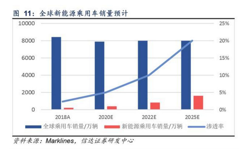 全球新能源乘用車有望同樣維持年30%以上復(fù)合增長(zhǎng)。根據(jù)德國(guó)汽車工業(yè)協(xié)會(huì)預(yù)測(cè),受中、美汽車市場(chǎng)銷量下滑影響,2019-2020年預(yù)計(jì)全球乘用車銷量將分別下滑5%和1%至8010和7890萬(wàn)輛。我們假設(shè)未來(lái)全球乘用車銷量維持8000萬(wàn)輛。 當(dāng)前全球傳統(tǒng)汽車龍頭與國(guó)內(nèi)整車企業(yè)加速電動(dòng)化布局,新能源乘用車滲透率將明顯提升,我們預(yù)計(jì)2022年和2025年全球 新能源乘用車滲透率將分別達(dá)到10%和20%,對(duì)應(yīng)新能源乘用車銷量分別為800和1600萬(wàn)輛,自2018年復(fù)合增速分別為 42%和35%。