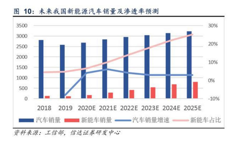 新能車發(fā)展規(guī)劃定調(diào)行業(yè)30%復(fù)合增長(zhǎng)。2019年12月,工信部發(fā)布《新能源汽車產(chǎn)業(yè)發(fā)展規(guī)劃(2021-2035)》征求意見(jiàn)稿, 意見(jiàn)稿明確到2025年,新能源汽車新車銷量占比達(dá)25%左右。根據(jù)中汽協(xié)數(shù)據(jù),2019年我國(guó)汽車銷量2576.9萬(wàn)輛,其中 新能源汽車銷量120.6萬(wàn)輛,滲透率為4.7%,我們假定我國(guó)汽車銷量以年復(fù)合2.0%的增速增長(zhǎng),則至2025年我國(guó)汽車銷量 為3228萬(wàn)輛,以新能源汽車滲透率為25%計(jì),則新能源汽車銷量為807萬(wàn)輛,年復(fù)合增速為30%。