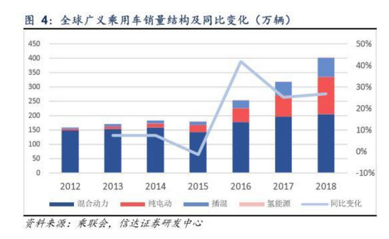 全球廣義新能源乘用車仍以普混為主,但占比迅速下降,新能源乘用車(不含普混)銷量增速連續(xù)三年維持60%以上。2018 年全球廣義新能源乘用車(包含純電、插混、普混、氫燃料)銷售402萬(wàn)輛,同比增長(zhǎng)26.8%,增速連續(xù)三年維持25%以上。 從內(nèi)部結(jié)構(gòu)看,廣義乘用車銷量仍以普通混合動(dòng)力為主,但其銷量占比呈下滑趨勢(shì),由2015年的79%降至2018年的51%, 同時(shí)新能源乘用車(不含普混)銷量占比迅速提升,從2015年的21%提升至2019年的49%。2018年全球新能源乘用車實(shí) 現(xiàn)銷量196.79萬(wàn)輛,同比增長(zhǎng)62%,增速連續(xù)三年維持60%以上。