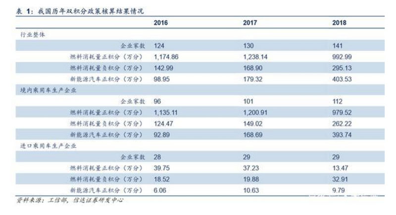 雙積分政策推動(dòng)力將逐步增強(qiáng)。從國(guó)內(nèi)雙積分政策來(lái)看,2019年起我國(guó)正式開始實(shí)施雙積分政策,2019和2020年新能源汽 車積分比例要求為10%和12%。2019年9月,工信部發(fā)布針對(duì)雙積分政策的征求意見(jiàn)稿,明確2021-2023年新能車積分比 例要求為14%、16%和18%。2018年,我國(guó)平均燃料消耗量積分為295.13萬(wàn)分,我們假設(shè)關(guān)聯(lián)企業(yè)充分抵扣,預(yù)計(jì)仍有72 萬(wàn)分燃料消耗量負(fù)積分需要由新能車積分抵扣。