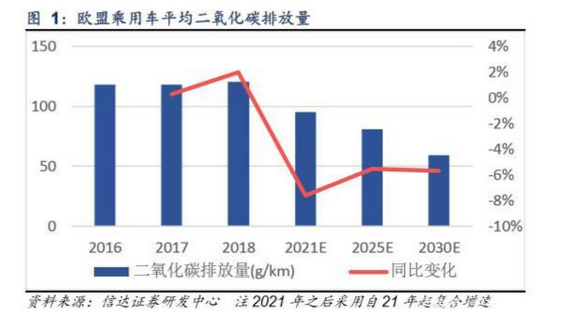 歐盟現(xiàn)行的二氧化碳排放法規(guī)為乘用車每行駛1km排放的二氧化碳量不能超過(guò)130g,2021年該標(biāo)準(zhǔn)將提升至歷史嚴(yán)的 95g/km,若不達(dá)標(biāo)將面臨95歐元/g*汽車銷量的罰款。此前,歐洲整車廠將銷售柴油車作為削減二氧化碳排放量的重要手段 之一,但近年受到柴油車排放造假事件影響,歐洲多國(guó)出臺(tái)政策嚴(yán)禁柴油車進(jìn)入市區(qū),導(dǎo)致近年來(lái)柴油車銷售比例下滑;同 時(shí),隨著二氧化碳排放量更高的SUV車型銷量增加,歐盟近兩年乘用車平均二氧化碳排放量同比呈上升態(tài)勢(shì),2017和2018 年分別同比增長(zhǎng)0.3%和1.9%至118.1和120.4g/km。
