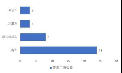 分析各整車廠商所推出的車型信息,共有24家整車廠推出客車車型,而專注于箱式運輸車和多用途車輛的整車廠商明顯增多,占比達(dá)25%。