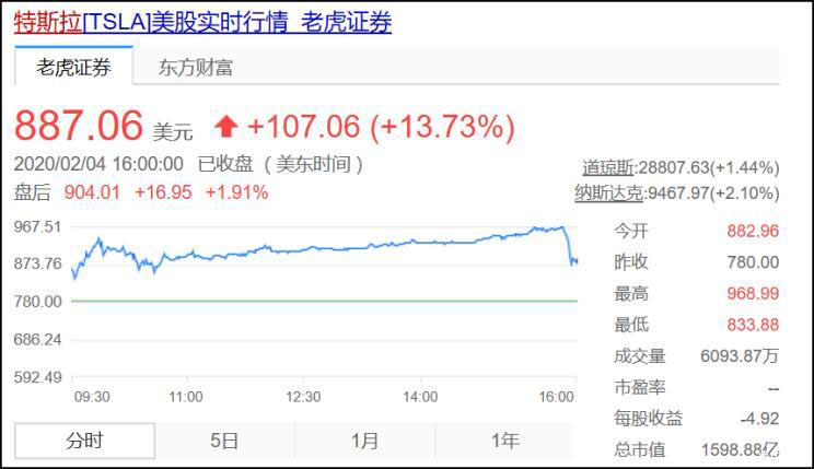 自2019年底突破420美元的關(guān)口后,特斯拉股價(jià)在2020年初再創(chuàng)新高。截至美國時(shí)間2月4日收盤,特斯拉股票上升至每股887.06美元,漲幅13.73%,創(chuàng)特斯拉股價(jià)新高峰。