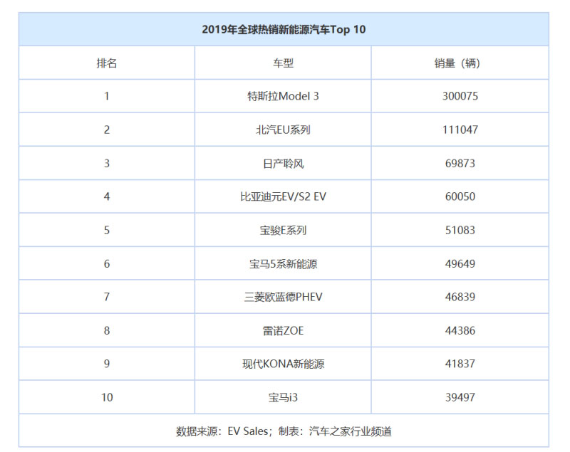 具體車型來(lái)看,2019年全年,特斯拉Model 3以銷量達(dá)到30萬(wàn)輛的新高度奪得熱銷車型第一名;排名第二的是北汽EU系列,日產(chǎn)聆風(fēng)則以全年銷售6.99萬(wàn)輛的成績(jī)打敗比亞迪元獲得了第三名。往年前十熱銷車型中,來(lái)自中國(guó)的產(chǎn)品通常占到一半以上,但2019年僅剩北汽EU系列、比亞迪元EV、寶駿E系列三款車型進(jìn)入榜單。
