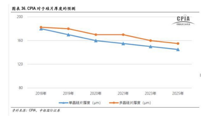 與主流單晶 PERC電池不同的是,異質(zhì)結(jié)電池在材料上以 N型硅片為基底。N型硅片在電學(xué)性能上較 P 型硅片更為優(yōu)越,但也因?yàn)閷?duì)硅料純度要求提高且生產(chǎn)成本相對(duì)較高等原因,目前市場(chǎng)價(jià)格相對(duì) 于 P 型硅片存在 8%-10%的小幅度溢價(jià),但同時(shí)異質(zhì)結(jié)電池單片功率提升(23.5%轉(zhuǎn)換效率對(duì)應(yīng)約 5.74W,單晶 PERC單片功率約 5.5W)對(duì)此溢價(jià)有攤薄效果,攤薄后單位溢價(jià)約 0.02元/W。此外,目 前行業(yè)主流單晶硅片厚度為 180μm,N型與 P型硅片厚度亦基本一致。但 N型硅片具備更高的減薄潛 力,異質(zhì)結(jié)電池已有 100μm 以下厚度的試驗(yàn)產(chǎn)品,轉(zhuǎn)換效率超過(guò) 24.5%。預(yù)計(jì)隨著硅片薄片化趨勢(shì)的 持續(xù),異質(zhì)結(jié)電池硅片成本有望得到進(jìn)一步降低,并取得相對(duì)于 P型電池的比較優(yōu)勢(shì)。