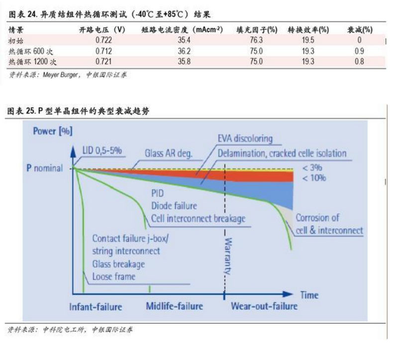 基本無(wú)光衰且可薄片化:目前在產(chǎn)的異質(zhì)結(jié)電池基本均為 N型硅片襯底,因此也具備 N型硅片相對(duì) 于目前主流 P型硅片的固有優(yōu)勢(shì),如無(wú)光致衰減(LID)和可薄片化(異質(zhì)結(jié)結(jié)構(gòu)本身亦對(duì)可薄片化 有所貢獻(xiàn))。N型硅片摻雜物質(zhì)為磷,硼含量極低,因此由硼氧對(duì)(B-O)導(dǎo)致的光衰(LID)基本可 以忽略,可提升電池片使用壽命和長(zhǎng)期發(fā)電量。同時(shí),可薄片化意味著同片數(shù)的電池對(duì)應(yīng)更少的硅 用量,有助于在硅成本方面形成比較優(yōu)勢(shì)。