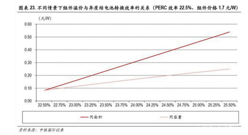 如考慮屋頂分布式光伏的典型情況,即項(xiàng)目經(jīng)濟(jì)性測(cè)算時(shí)的約束條件非裝機(jī)容量而是屋頂面積,異 質(zhì)結(jié)組件高轉(zhuǎn)換效率帶來(lái)的高發(fā)電功率優(yōu)勢(shì)將更為明顯地體現(xiàn)出來(lái)。對(duì)比同面積(屋頂分布式)與 同容量(地面電站)兩種情景下異質(zhì)結(jié)組件合理溢價(jià)與電池轉(zhuǎn)換效率的關(guān)系,可以得到在無(wú)其他發(fā) 電增益的情況下,異質(zhì)結(jié)組件溢價(jià)在同容量情景下的變化范圍為 0.082-0.250元/W,幅度約 0.17元/W, 而在同面積情景下的變化范圍為 0.082-0.539元/W,幅度約 0.46元/W;組件溢價(jià)對(duì)轉(zhuǎn)換效率的敏感性, 同面積情景明顯高于同容量情景。由此可以判斷,在一般情況下,相對(duì)于地面電站,屋頂分布式光 伏使用異質(zhì)結(jié)電池更為劃算,異質(zhì)結(jié)電池對(duì)單晶 PERC的性?xún)r(jià)比優(yōu)勢(shì)或先出現(xiàn)于屋頂分布式。
