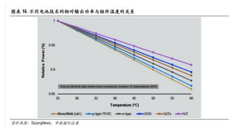 低溫度系數(shù)提高發(fā)電穩(wěn)定性:光伏電池在發(fā)電的過(guò)程中由于太陽(yáng)光的照射和自身電流產(chǎn)生的熱效應(yīng), 電池表面溫度會(huì)有一定程度的上升。一般情況下當(dāng)溫度上升時(shí),光伏電池的開(kāi)路電壓下降、短路電 流上升,且電壓降幅一般大于電流升幅,因此溫度上升一般會(huì)導(dǎo)致電池轉(zhuǎn)換效率下降。目前主流的 單晶 PERC電池的溫度系數(shù)一般在-0.4%/℃(即溫度每升高 1℃,發(fā)電功率相對(duì)于基準(zhǔn)功率降低 0.4%) 左右,而異質(zhì)結(jié)電池的溫度系數(shù)僅約-0.25%/℃,因此在長(zhǎng)時(shí)間光照溫度升高的情況下,使用異質(zhì)結(jié) 電池的光伏電站發(fā)電量和發(fā)電穩(wěn)定性都更高。