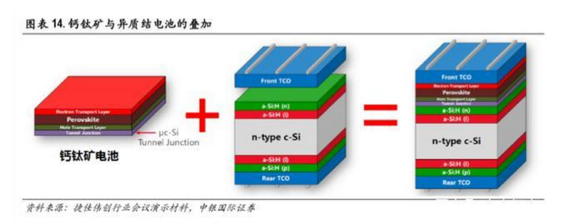 異質(zhì)結(jié)疊加鈣鈦礦進(jìn)一步提升效率上限:在疊加 IBC技術(shù)成為 HBC電池的路徑之外,異質(zhì)結(jié)電池同 時(shí)也比較適合疊加鈣鈦礦成為疊層/多結(jié)電池。疊層技術(shù)需要用低溫沉積工藝(PVD/CVD 方式)實(shí)現(xiàn) 短波長(zhǎng)吸收(鈣鈦礦)和長(zhǎng)波長(zhǎng)吸收(HJT)的結(jié)合,其所應(yīng)用的 TCO膜層已然在異質(zhì)結(jié)電池中采用, 而在 HJT單結(jié)中損失的藍(lán)光可被上層鈣鈦礦收集利用。整體而言,HJT與鈣鈦礦在兼容性上有著天然 的優(yōu)勢(shì),目前英國(guó) Oxford PV的疊層電池已獲得了 28%的實(shí)驗(yàn)室轉(zhuǎn)換效率,后續(xù)甚至有望進(jìn)一步提升 至 30%以上。